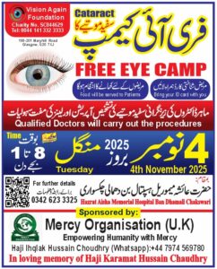 We warmly invite everyone to attend our Free Eye Camp organized for the people of Chakswari. Please arrive early to ensure you are seen by our medical team.