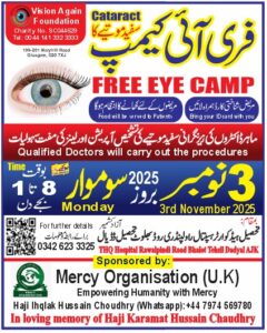 We invite everyone to attend our Free Eye Camp organized for the people of Dadyal. Please arrive early to ensure you are seen by our medical team.